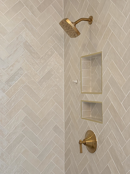We started with demoing the bathroom and adding some structure to the floors with the Ditra Membrane. We kept their existing vanities and bathtub. Otherwise, everything was redone! I had countertops templated as soon as the old ones were removed. Then we started tiling…. for days! Lots of tile :o) We did herringbone on the walls and tub surround, pebbles on the shower floor, and large hex tiles for the bathroom floor.