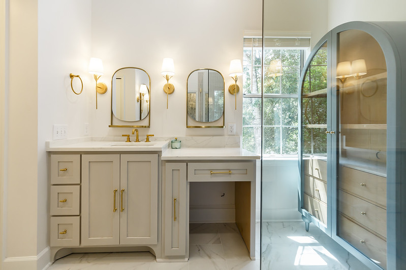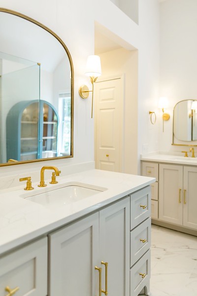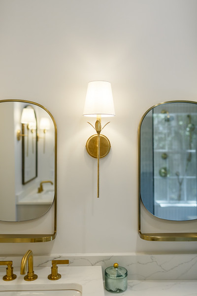 A few notes… the flushmount from anthro is sold out so I linked to the chandelier version. Also, the small mirror wasn’t letting me link. It can be found HERE. All paint is Farrow & Ball. Colors: Inchyra Blue for wainscoting, Wevet for walls, and Cornforth White for vanities. Cabinet Pulls weren’t linked but can be found HERE
